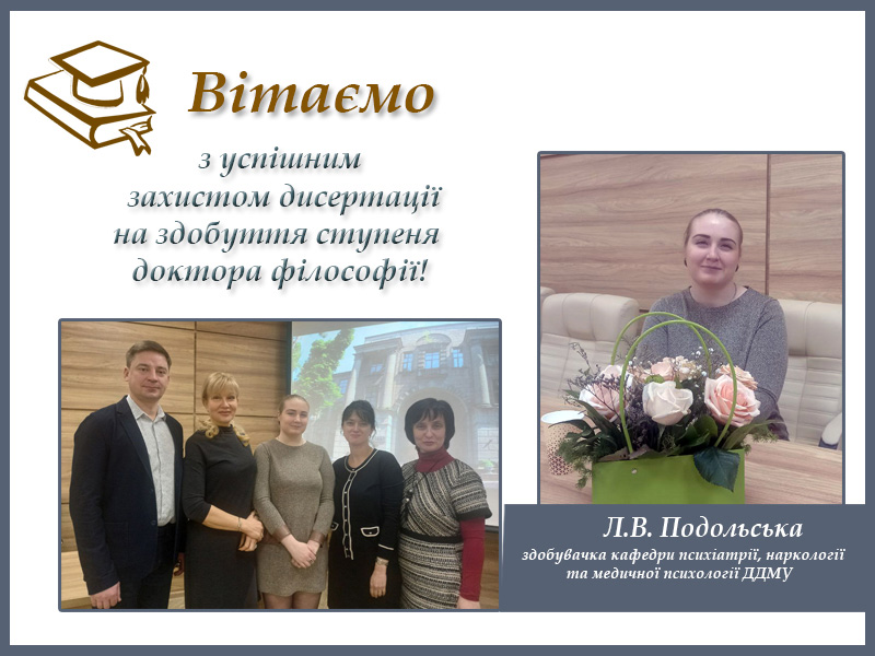 На підставі прилюдного захисту дисертації спеціалізована вчена рада ДФ 08.601.093 під головуванням професора Вікторії Вікторівни Огоренко ухвалила присудити ступінь доктора філософії Людмилі Володимирівні Подольській. Спеціальність «Медицина», галузь знань «Охорона здоров’я».