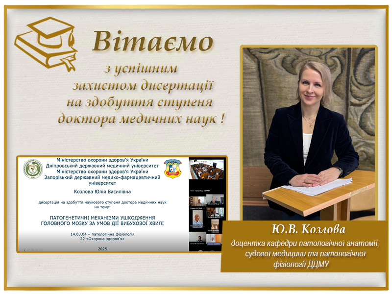 16 червня 2025 року у м. Запоріжжя, на засіданні спеціалізованої вченої ради Д 17.600.01 при Запорізькому державному медико-фармацевтичному університеті МОЗ України відбувся захист дисертації доцента кафедри патологічної анатомії, судової медицини та патологічної фізіології ДДМУ Юлії Василівни Козлової на здобуття наукового ступеня доктора медичних наук за спеціальністю 14.03.04 – «патологічна фізіологія».