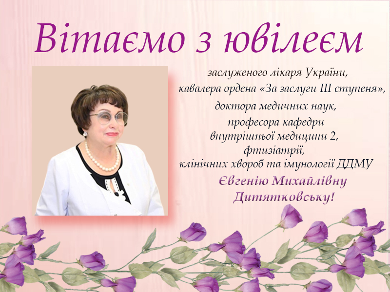 Шановна Євгенія Михайлівно! В день Вашого знаменного ювілею прийміть найщиріші вітання від багатотисячного колективу викладачів і студентів Дніпровського державного медичного університету.