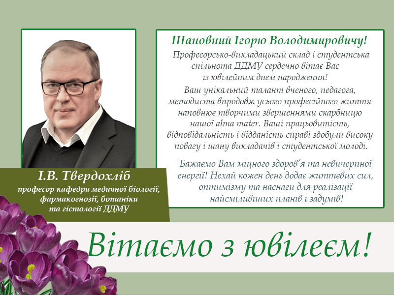 20 березня 2025 року відзначає ювілейну дату професор кафедри медичної біології, фармакогнозії, ботаніки та гістології ДДМУ Ігор Володимирович Твердохліб.