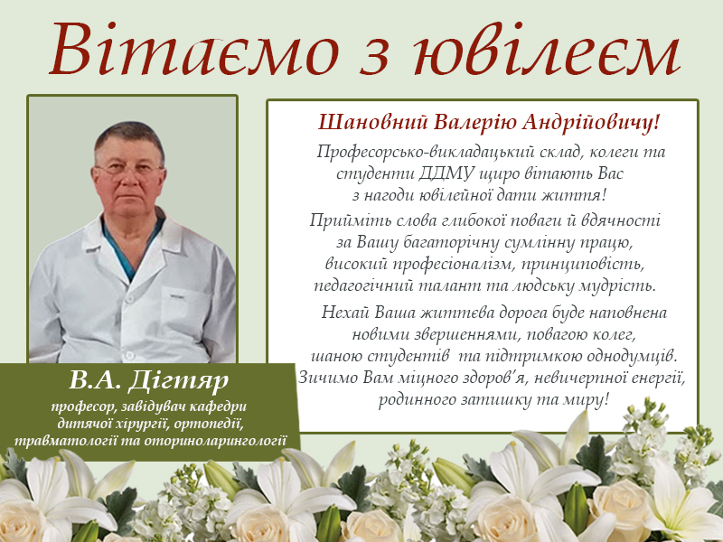 2 серпня 2025 року святкує ювілей завідувач кафедри дитячої хірургії, ортопедії, травматології та оториноларингології, професор Валерій Андрійович Дігтяр.