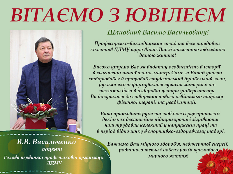 7 січня 2026 року відзначає ювілей голова профспікової організаціїї нашого університету доцент Василь Васильович Васильченко.