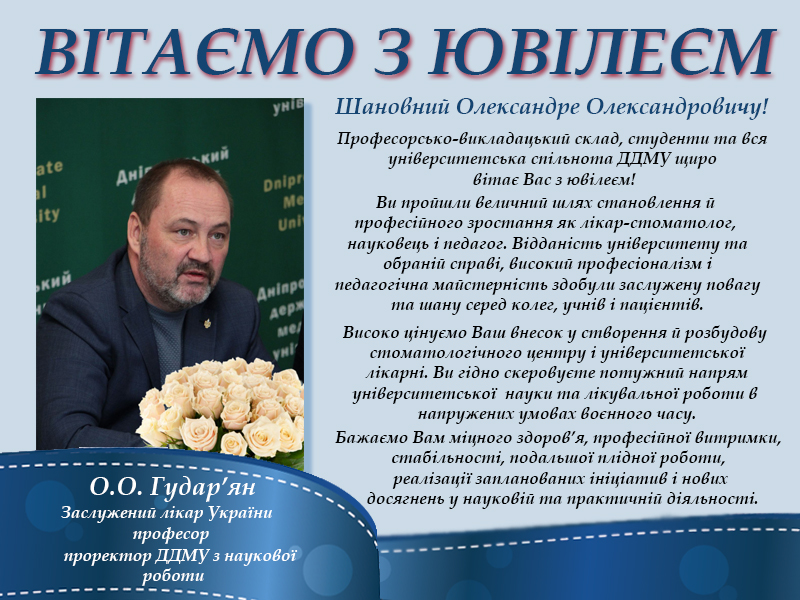 6 січня 2026 року відзначає ювілей проректор ДДМУ з наукової роботи, професор кафедри хірургічної стоматології, імплантології та пародонтології Олександр Олександрович Гудар’ян.