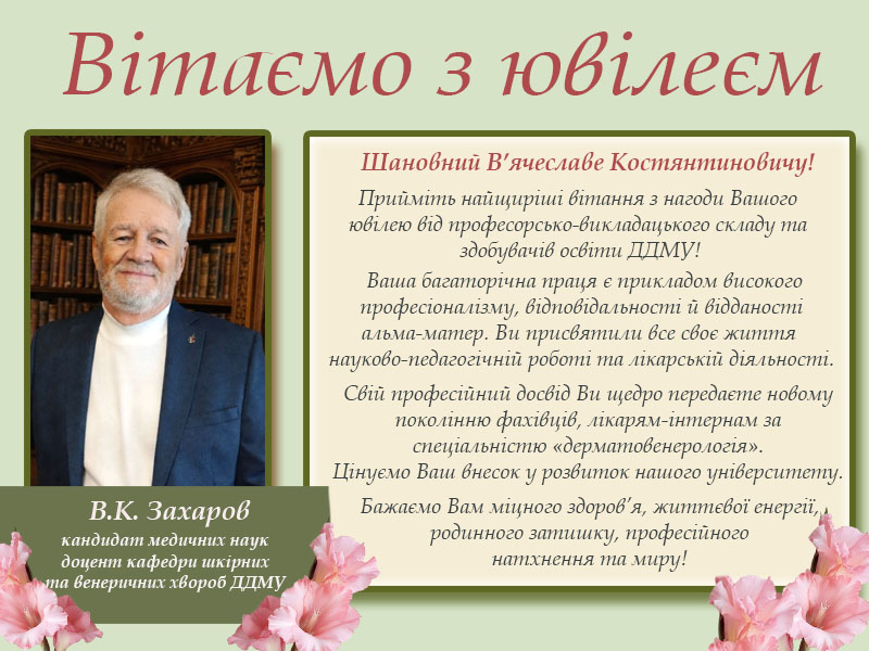 15 січня 2026 року святкує ювілей кандидат медичних наук, доцент кафедри шкірних та венеричних хвороб В’ячеслав Костянтинович  Захаров.
