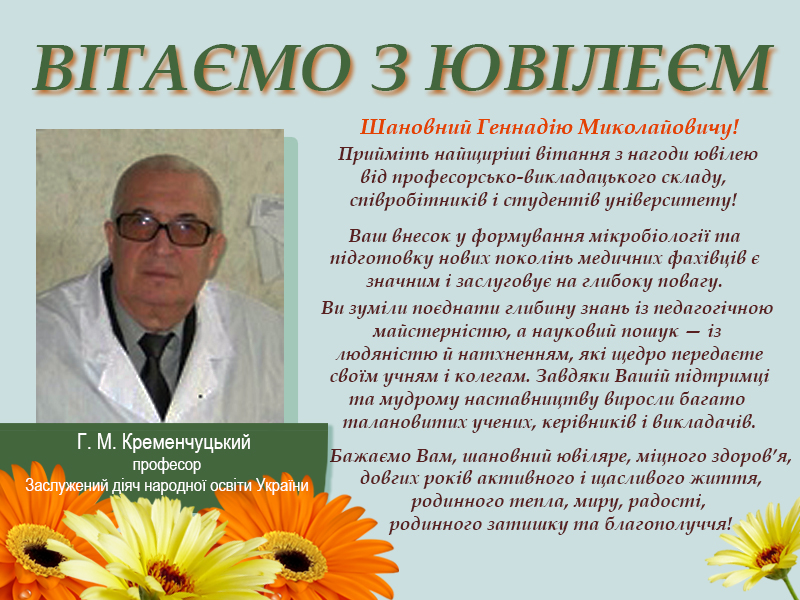 3 листопада 2025 року свій ювілей відзначає професор кафедри мікробіології. вірусології, імунології, епідеміології та медико-біологічної фізики і інформатики Геннадій Миколайович Кременчуцький — знаний мікробіолог, Заслужений діяч народної освіти України, людина високої професійної культури, чий життєвий шлях є прикладом відданості науці й альма-матер.