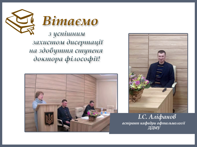 На засіданні спеціалізованої вченої ради ДФ 08.601.096  під головування професора Жилюка Володимира Івановича було розглянуто дисертацію здобувача ступеня доктора філософії, асистента кафедри офтальмології Дніпровського державного медичного університету Аліфанова Ігоря Сергійовича.