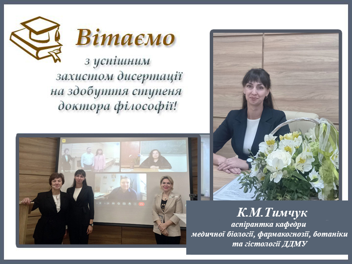 У ДДМУ відбувся захист дисертації здобувачки ступеня доктора філософії, аспірантки кафедри медичної біології, фармакогнозії, ботаніки та гістології ДДМУ Тимчук Катерини Миколаївни на тему: «Морфофункціональні особливості ремоделювання тонкої кишки в ембріогенезі щура під впливом хлориду кадмію» спеціальність 091 «Біологія».