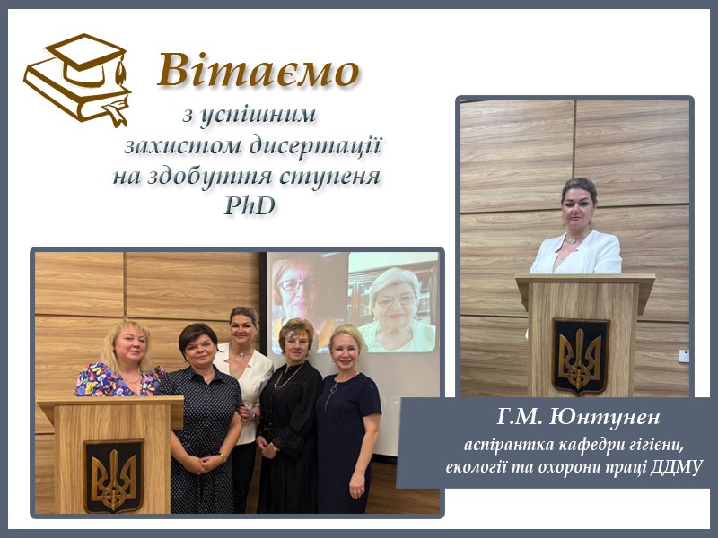 У Дніпровському державному медичному університеті відбувся захист дисертації на здобуття наукового ступеня доктора філософії за спеціальністю 229 «Громадське здоров’я». Свою наукову роботу представила аспірантка кафедри гігієни, екології та охорони праці Ганна Михайлівна Юнтунен.