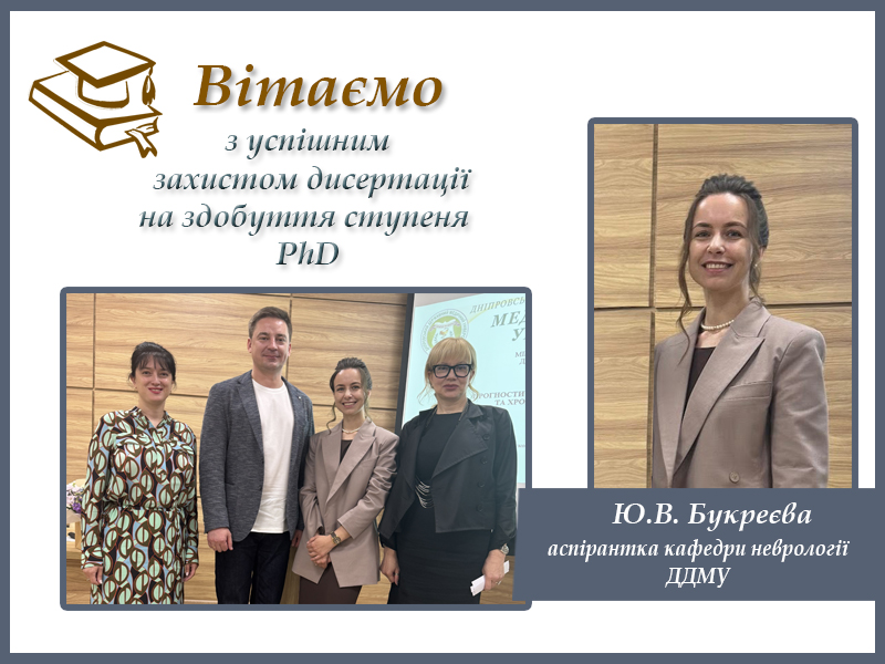 У ДДМУ відбувся захист дисертації здобувача ступеня доктора філософії, аспірантки кафедри неврології Дніпровського державного медичного університету Юлії Володимирівни Букреєвої за спеціальністю 222 «Медицина».