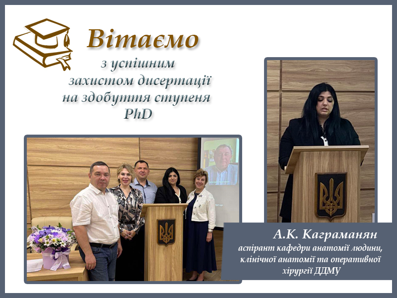 У ДДМУ відбувся захист дисертації здобувачки ступеня доктора філософії, аспірантки кафедри анатомії людини, клінічної анатомії та оперативної хірургії ДДМУ Альони Камоївни Каграманян.