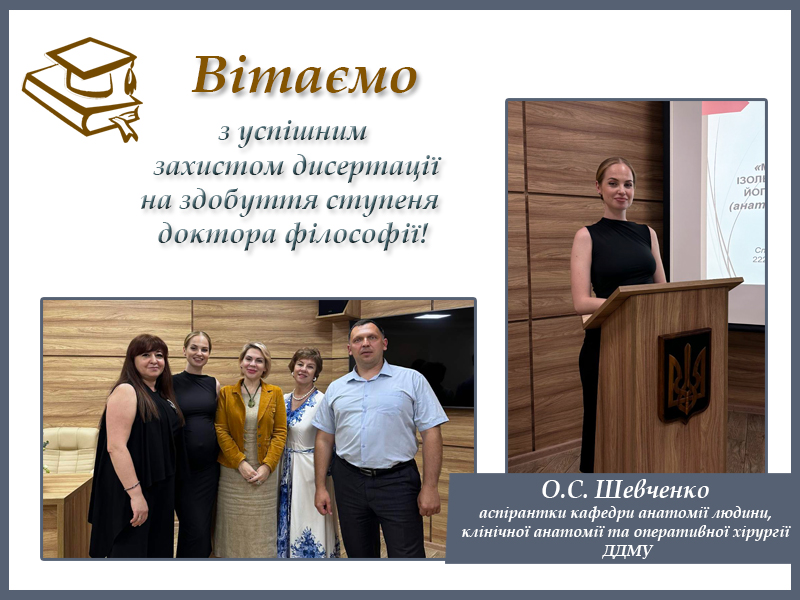 У ДДМУ відбувся розгляд дисертації здобувачки ступеня доктора філософії, аспірантки кафедри анатомії людини, клінічної анатомії та оперативної хірургії Дніпровського державного медичного університету Шевченко Олени Сергіївни.