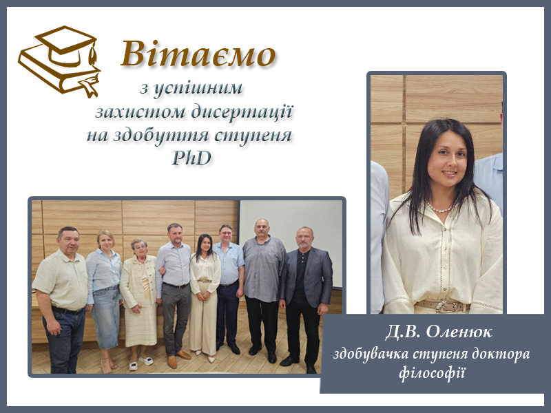 На підставі захисту дисертації спеціалізована вчена рада під головуванням професора Володимира Івановича Жилюка ухвалила присудити Діані Вікторівні Оленюк ступінь доктора філософії. Спеціальність «Медицина», галузь знань «Охорона здоров’я».