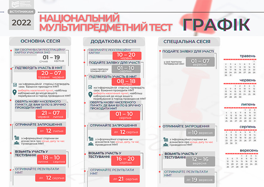 Наказом Міністерства освіти і науки України від 12 травня 2022 року № 434 затверджено календарний план організації та проведення у 2022 році національного мультипредметного тесту (НМТ). Нагадаємо, що НМТ – це тест для вступу на бакалаврський (магістерський для медиків) ступінь закладів вищої освіти у 2022 році.