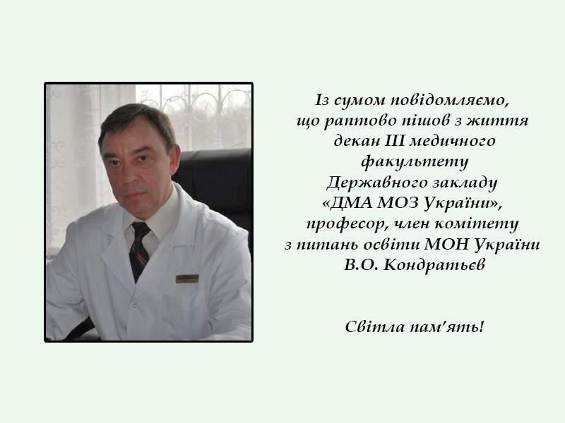 10 серпня 2017 року, на 59 році раптово пішов із життя декан ІІІ медичного факультету Державного закладу «Дніпропетровська медична академія Міністерства охорони здоров’я України», професор, член комітету з питань освіти МОН України В'ячеслав Олександрович Кондратьєв.