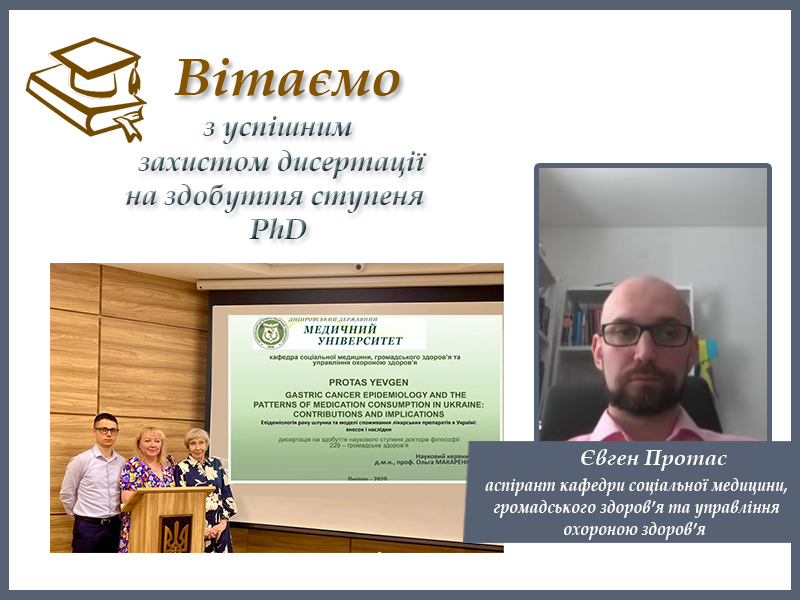 Тема дисертаційного дослідження: «Gastric cancer epidemiology and the patterns of medication consumption in Ukraine: contributions and implications» / «Епідеміологія раку шлунка та моделі споживання лікарських препаратів в Україні: внесок і наслідки»