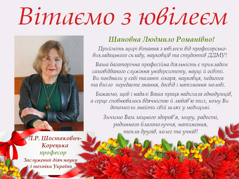 22 жовтня 2025 року святкує ювілейну дату професор Людмила Романівна Шостакович-Корецька - видатний вчений, талановитий дитячий лікар-інфекціоніст, обдарований педагог, Заслужений діяч науки і техніки України, професор кафедри інфекційних хвороб ДДМУ.